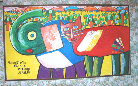 止揚ギャラリーの貼り絵です。額に入っているのを撮影していますのでガラスが少しハレーションを起こしています。学園の皆さんとお茶をご一緒して、先生や止揚シスターズの皆さんとも楽しい時間を過ごさせて頂きました。