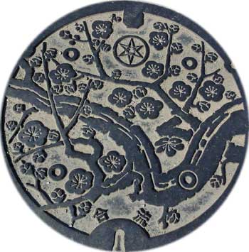 表門前の梅畑にまず堪能し、一の木戸をくぐって孟宗竹林を歩き、杉林を抜ければ、千波湖に向かって広がる梅林を上から眺めます。あいだの常磐線を列車が走り抜けてゆきます。 水戸梅まつり大使のお嬢さんと韓流スターとの撮影会も行われていました。 『鄙からの発信』定番の蓋も水戸市の意匠は梅でした。