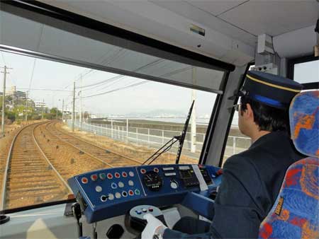 厳島神社の鎮座する宮島へは、別個に宮島電鉄が運行されているのではなくて、広島駅前から始発する市電が、そのまま専用軌道に乗り入れて郊外線として運行されています。 郊外の住宅地を抜けて宮島へ近づくと窓の外に海を眺めながら走ります。 スタイリッシュな運転席は、ニューポートラムのものです。